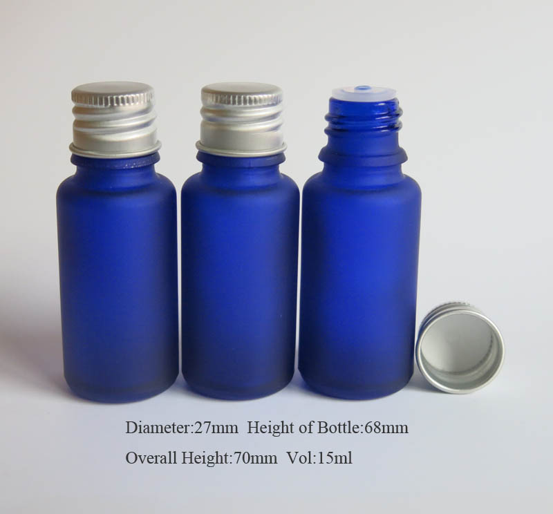 High quality 15ml frost blue glass bottle with dropper insert and metallic lid,0.5 oz glass essential oil bottle, glass bottle 15cc,promotion glass bottles wholesale