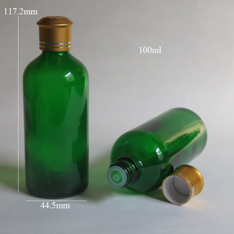 High quality 100ml green glass bottle with dropper insert and metallic lid,3.67oz glass essential oil bottle, glass bottle 100cc, packing glass bottles wholesale